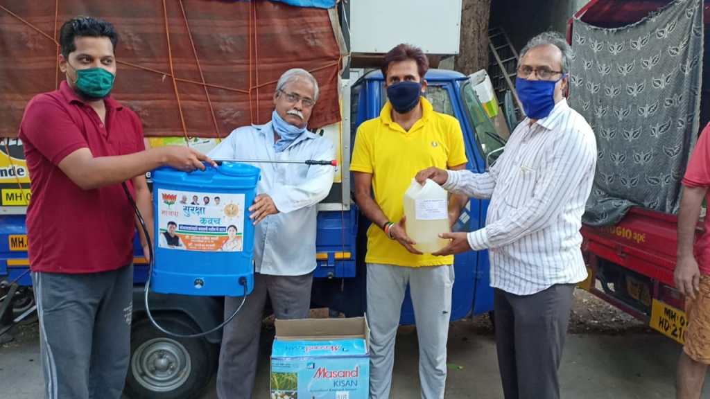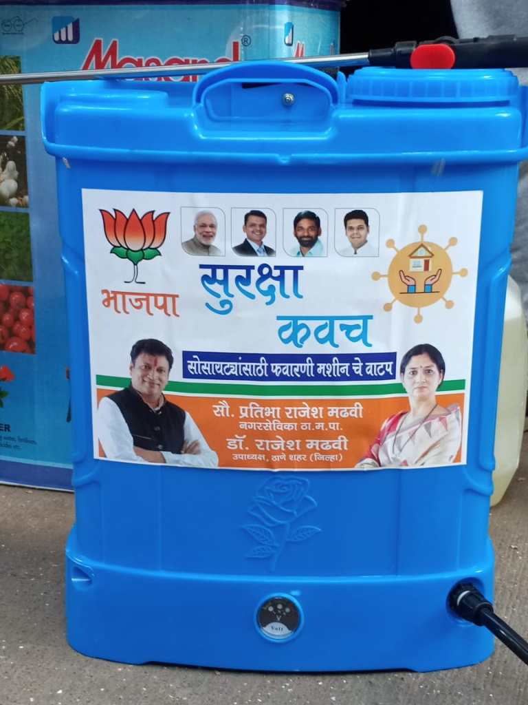 कोरोनाने सर्वत्र कहर केला आहे. रोज हजारोंनी रूग्ण संख्या वाढत आहे . सरकारी यंत्रणेवर प्रचंड ताण आहे . अशावेळी समाजालाच स्वावलंबी बनवणे ही काळाची गरज आहे. या बाबींचा विचार करून आमदार संजयजी केळकर व ठाणे भाजपा अध्यक्ष आमदार निरंजनजी डावखरे यांच्या मार्गदर्शनाखाली प्रभागातील नागरिकांना सॅनिटाईझेशन फवारणी पंपाच्या व सोबत फवारणी केमिकल च्या रुपाने सुरक्षा कवच देण्यात येत आहे. सदरचे वाटप स्थानिक नगरसेविका सौ. प्रतिभा मढवी व भाजपा उपाध्यक्ष ,ठाणे गौरव सेवा प्रतिष्ठान चे डॉ. राजेश मढवी यांचे तर्फे प्रभागातील मोठ्या सोसायट्या तसेच स्लम भाग यांना करण्यात आले.