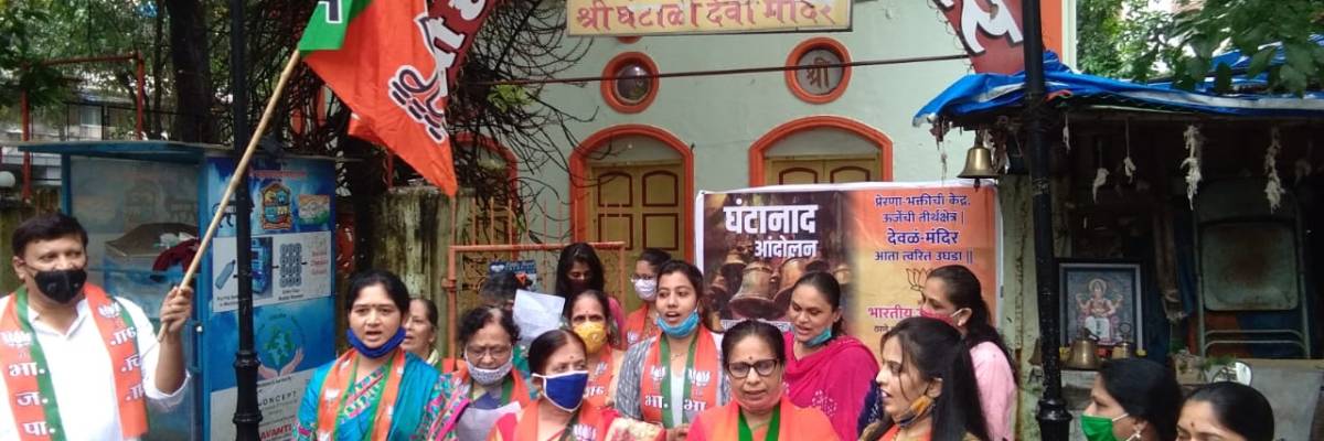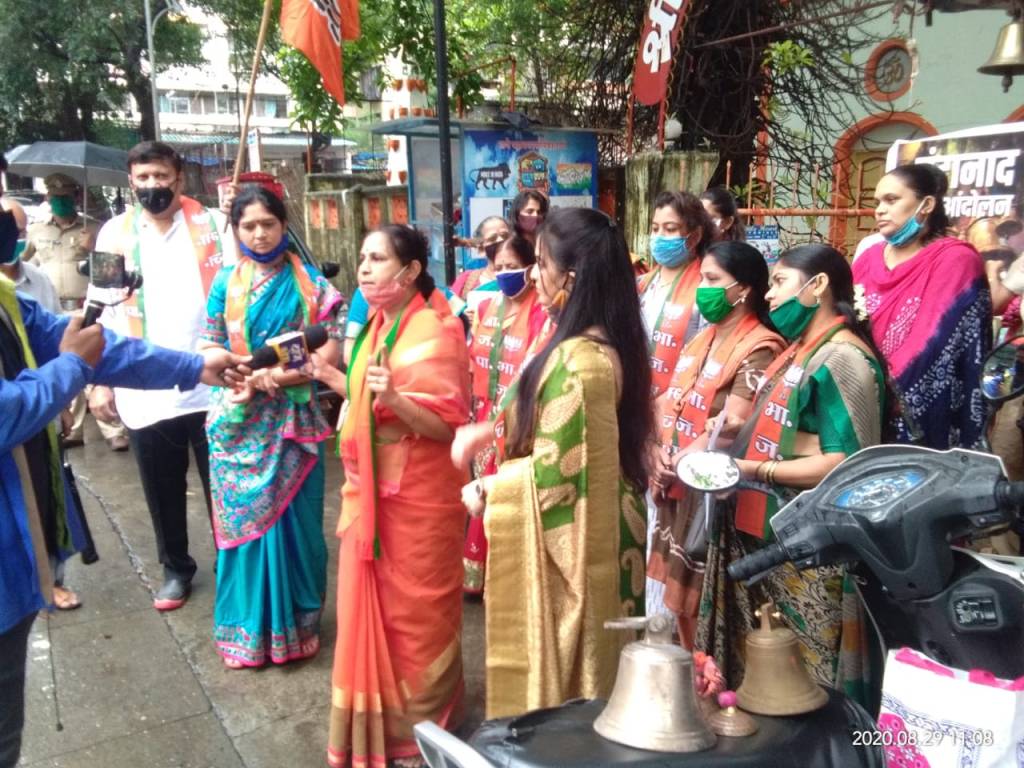 आज संपूर्ण महाराष्ट्रभर भाजपा तर्फे दार उघड उद्धवा दार उघड अशा घोषणा देत सर्व मंदिरांसमोर घंटानाद करण्यात आला. महाराष्ट्रातील सर्व मंदिरे भाविकांसाठी उघडी करावीत, अशी आग्रही मागणी राज्य सरकारकडे करण्यात आली. नौपाडा येथील घंटाली मंदिरा बाहेर झालेल्या आंदोलनात प्रदेश उपाध्यक्षा माधवी ताई नाईक, नगरसेविका मृणाल पेंडसे, नगरसेविका प्रतिभा मढवी, शमाताई पातकर , मानसी जोशी,सहिता देव, शिल्पा उतेकर, कांगणे, कुंटेताई तसेच सुरेंद्र हीर्लेकर व डॉ.राजेश मढवी आदी सहभागी झाले होते. या प्रसंगी सर्व भाजपा पदाधिकारी व नागरिक मोठ्या संख्येने उपस्थित होते.